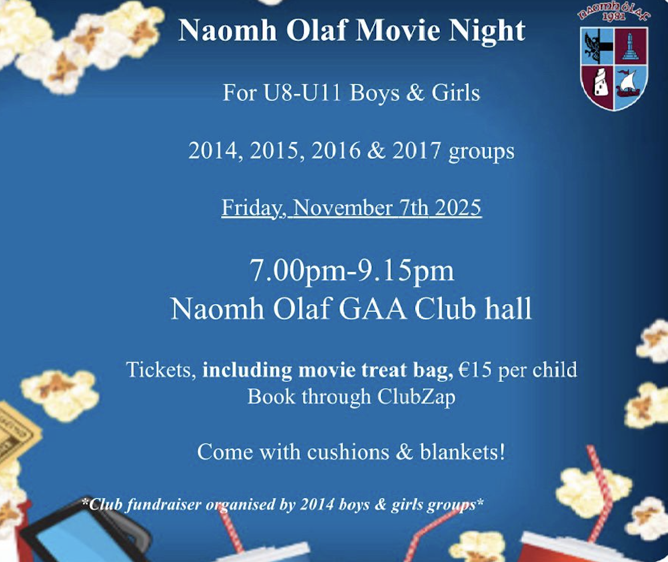 MOVIE NIGHT for U8 to U11 Boys and Girls, Friday the 7th of November in Olafs Club Hall, From 7pm to 9.15pm, Tickets are €15 each which includes a Movie Treat Bag.